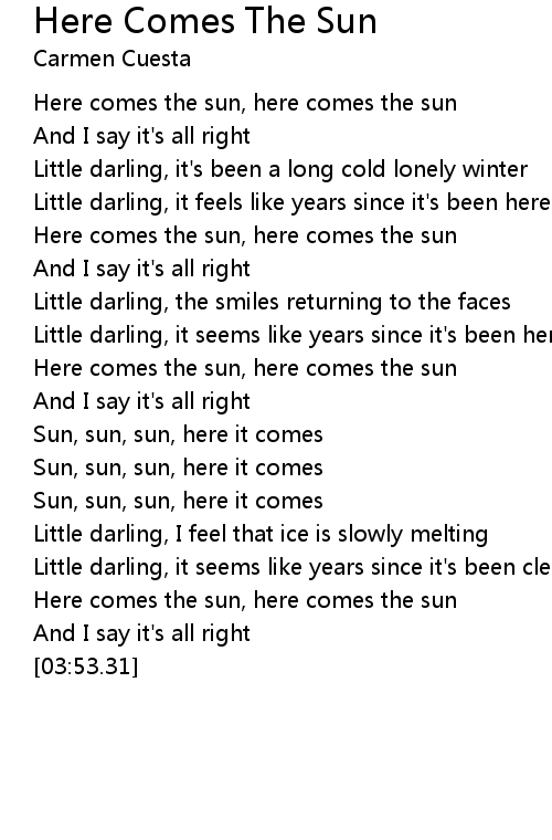 Mauve - Here Comes The Sun (Lyrics) Leave a like if you enjoy the music :) Follow my Playlist on Spotify: . Here Comes The Sun Lyrics are a subject that is being searched for and favored by netizens now. You can Save the Here Comes The Sun Lyrics here. Save all royalty-free picture. Here Comes The Sun - The Beatles (Lyrics), Here Comes The Sun - The Beatles (Lyrics) Choose Your Favorite Artist Here: http://bit.ly/MyFavoriteArtist Stay tuned for brand .